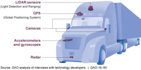 Sensors, such as Lidar, radar, cameras, ultrasonic, and GPS, are crucial to self-driving technology.[32] Due to different sensors performing best at different functions required for autonomous driving and the financial and technological challenges associated with relying on only one sensor, a successful self-driving truck system will likely feature many.[33]