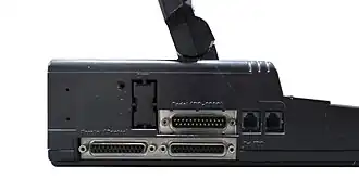 All entries in the PC-4500 line come with one parallel port and one external floppy port for use with an optional external 5.25-inch floppy disk drive. Two proprietary expansion slots may hold a video card for output to external CGA monitors, a RAM card for addition memory (accordant to the Expanded Memory Specification), an EPROM card, a serial port card, and a 1,200-baud modem card.[7] The EPROM card holds multiple EPROM chips, up to 768 KB in total, onto which software can be burned for instantaneous loading without slowdown from floppy or hard disk drive access.[8] The memory card, the EPROM card, and the video card all occupy the same slot and cannot be used in tandem. The serial and modem cards also occupy the same slot, but the modem card comes with a serial port its own.[7] A car charger and carrying case were respectively $30 and $75 options.[5]