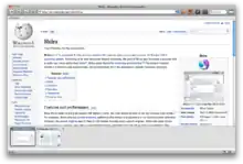 The features of Shiira included appearance options. Users could switch between Aqua or Metal styles in addition to changing the buttons' appearances. However, in the 2.0 release, changes in themes were not available. Tabs were also customizable. Another option was "Tab Exposé", which acted much like the Exposé feature of Mac OS X; each tab was visible in its totality, enabling users to select the tab to which they wished to navigate.[2] The 1.x releases of Shiira also had a page-turning effect for transitions between any two webpages; however, this was dropped from 2.x releases. The interface in Shiira 2.0 could be set to display tabs as thumbnails along the bottom or sides of the window.[3]