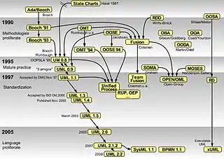 The Shlaer–Mellor method is one of a number of software development methodologies which arrived in the late 1980s. Most familiar were object-oriented analysis and design (OOAD) by Grady Booch, object modeling technique (OMT) by James Rumbaugh, object-oriented software engineering by Ivar Jacobson and object-oriented analysis (OOA) by Shlaer and Mellor.[2][3] These methods had adopted a new object-oriented paradigm to overcome the established weaknesses in the existing structured analysis and structured design (SASD) methods of the 1960s and 1970s.[4] Of these well-known problems, Shlaer and Mellor chose to address: