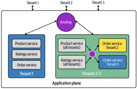 The application plane—which varies a great deal depending on the nature of the product—implements the core functionality of the SaaS product.[59] Key design issues include separating different tenants so they cannot view or change other tenants' data or resources.[61] Except for the simplest SaaS applications, some microservices and other resources are allocated on a per-tenant basis, rather than shared between all tenants.[62] Routing functionality is necessary to direct tenant requests to the appropriate services.[60]