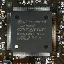 Sound Blaster Live! (August 1998) saw the introduction of the EMU10K1 audio processor. Manufactured in a 0.35 μm 3-metal-layer CMOS process, it is a 2.44 million transistor ASIC rated at 1000 MIPS. The EMU10K1 featured hardware acceleration for DirectSound and EAX 1.0 and 2.0 (environmental audio extensions), along with a high-quality 64-voice MIDI sample-based synthesizer and an integrated FX8010 DSP chip for real-time digital audio effects.[2]