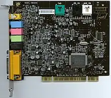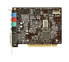Sound Blaster Live! is a PCI add-on sound card from Creative Technology Limited for PCs. Moving from ISA to PCI allowed the card to dispense with onboard memory, storing digital samples in the computer's main memory and then accessing them in real time over the bus. This allowed for a much wider selection of, and longer playing, samples. It also included higher quality sound output at all levels, quadrophonic output, and a new MIDI synthesizer with 64 sampled voices. The Live! was introduced on August 11, 1998[1] and variations on the design remained Creative's primary sound card line into the early 2000's.