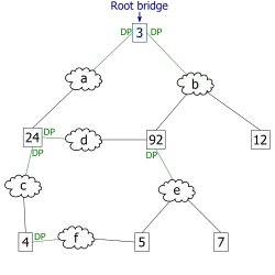 - In some cases, there may still be a tie, as when the root bridge has multiple active ports on the same network segment (see above) with equally low root path costs and bridge IDs, or, in other cases, multiple bridges are connected by multiple cables and multiple ports. In each case, a single bridge may have multiple candidates for its root port. In these cases, candidates for the root port have already received BPDUs offering equally-low (i.e. the "best") root path costs and equally-low (i.e. the "best") bridge IDs, and the final tiebreaker goes to the port that received the lowest (i.e. the "best") port priority ID, or port ID.[12]