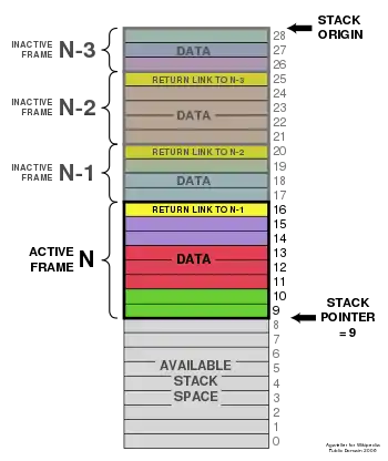 A typical stack, storing local data and call information for nested procedure calls (not necessarily nested procedures). This stack grows downward from its origin. The stack pointer points to the current topmost datum on the stack. A push operation decrements the pointer and copies the data to the stack; a pop operation copies data from the stack and then increments the pointer. Each procedure called in the program stores procedure return information (in yellow) and local data (in other colors) by pushing them onto the stack.