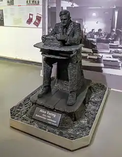 A statue of Alan Turing, created in slate by Stephen Kettle in 2007, is located at Bletchley Park in England as part of an exhibition that honours Turing (1912–1954).[1][2] It was commissioned by the American businessman and philanthropist Sidney Frank (1919–2006).[3]