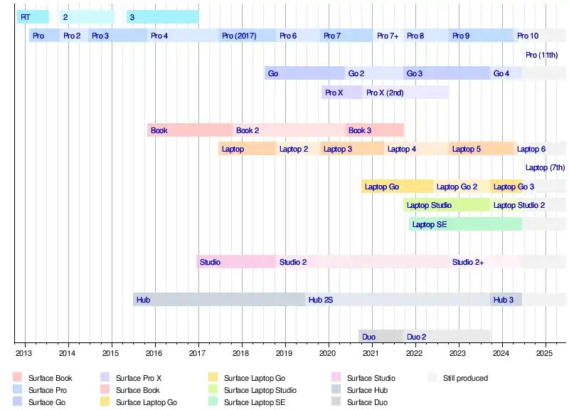 Surface DuoSurface Hub 2SSurface HubSurface Studio 2Surface Studio 2Surface StudioSurface Laptop SESurface Laptop StudioSurface Laptop Go 3Surface Laptop Go 2Surface Laptop GoSurface Laptop 6Surface Laptop 5Surface Laptop 4Surface Laptop 3Surface Laptop 2Surface LaptopSurface Book 3Surface Book 2Surface BookSurface Pro XSurface Pro XSurface Go 4Surface Go 3Surface Go 2Surface GoSurface Pro 10Surface Pro 9Surface Pro 8Surface Pro 7Surface Pro 7Surface Pro 6Surface Pro (2017)Surface Pro 4Surface Pro 3Surface Pro 2Surface ProSurface 3Surface 2Surface (2012 tablet)