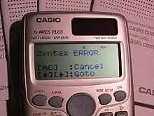 A syntax error is one of several types of errors on calculators (most commonly found on scientific calculators and graphing calculators), representing that the equation that has been input has incorrect syntax of numbers, operations and so on. It can result in various ways, including but not limited to:
