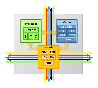The short-pipeline, in-order, three-issue cores implement a MIPS-inspired[2] VLIW instruction set. Each core has a register file and three functional units: two integer arithmetic logic units and a load–store unit. Each of the cores ("tile") has its own L1 and L2 caches plus an overall virtual L3 cache which is an aggregate of all the L2 caches.[3] A core is able to run a full operating system on its own or multiple cores can be used to run a symmetrical multi-processing operating system.