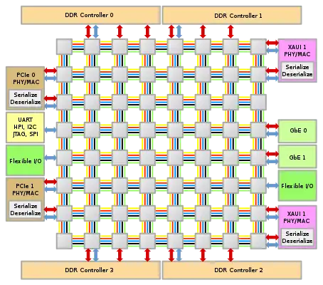 TILE64[1] is a VLIW ISA multicore processor manufactured by Tilera. It consists of a mesh network of 64 "tiles", where each tile houses a general purpose processor, cache, and a non-blocking router, which the tile uses to communicate with the other tiles on the processor.