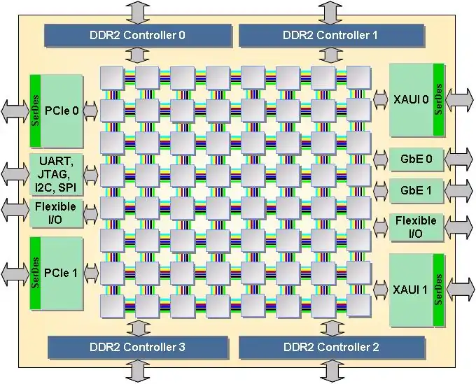 TILEPro64 has four DDR2 controllers at up to 800MT/s, two 10-gigabit Ethernet XAUI interfaces, two four-lane PCIe interfaces, and a "flexible" input/output interface, which can be software-configured to handle a number of protocols. The processor is fabricated using a 90 nm process and runs at speeds of 600 to 866 MHz.