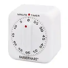 Mechanical timers use clockwork to measure time.[1] Manual timers are typically set by turning a dial to the time interval desired, turning the dial stores energy in a mainspring to run the mechanism. They function similarly to a mechanical alarm clock, the energy in the mainspring causes a balance wheel to rotate back and forth. Each swing of the wheel releases the gear train to move forward by a small fixed amount, causing the dial to move steadily backward until it reaches zero when a lever arm strikes a bell. The mechanical kitchen timer was invented in 1926.