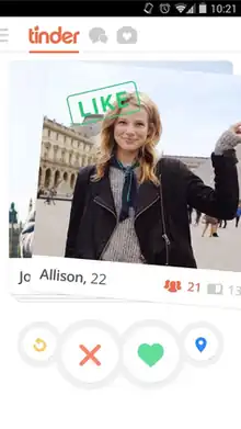 Tinder is an online dating and geosocial networking application launched in 2012. On Tinder, users "swipe right" to like or "swipe left" to dislike other users' profiles, which include their photos, a short bio, and some of their interests. Tinder uses a "double opt-in" system, also called "matching", where two users must like each other before they can exchange messages.[4][5][6][7]