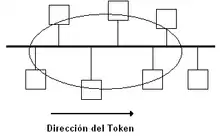 Token bus is a network implementing a token-passing protocol over a virtual ring on a coaxial cable.[1] A token is passed around the network nodes and only the node possessing the token may transmit. If a node doesn't have anything to send, the token is passed on to the next node on the virtual ring. Each node must know the address of its neighbour in the ring, so a special protocol is needed to notify the other nodes of connections to, and disconnections from, the ring.[2]
