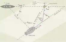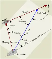 A straight-running torpedo has a gyroscope-based control system that ensures that the torpedo will run a straight course.[26] The torpedo can run on a course different from that of the submarine by adjusting a parameter called the gyro angle, which sets the course of the torpedo relative to the course of the submarine (see Figure 2). The primary role of the TDC is to determine the gyro angle setting required to ensure that the torpedo will strike the target.