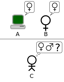 Turing's original article describes a simple party game involving three players. Player A is a man, player B is a woman and player C (who plays the role of the interrogator) is of either gender. In the imitation game, player C is unable to see either player A or player B, and can communicate with them only through written notes. By asking questions of player A and player B, player C tries to determine which of the two is the man and which is the woman. Player A's role is to trick the interrogator into making the wrong decision, while player B attempts to assist the interrogator in making the right one.[8]