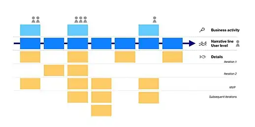 User story mapping[33] uses workshops with users to identify first the main business activities. Each of these main activities may involve several kind of users or personas.