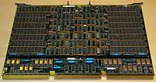 The memory system consists of three major parts, a memory controller, a transistor-transistor logic (TTL) bus and one to eight memory array modules. The memory controller is implemented with ECL gate arrays and resides on an NMI bus module. It implements a TTL bus to which memory array modules are connected. Three memory modules were available for the VAX 8800: a 4 MB module, a 16 MB module and a 64 MB module. The 4 MB array module is an eight-layer printed circuit board populated by metal oxide semiconductor (MOS) dynamic random access memory (DRAM) devices and medium-scale integration (MSI) FAST transistor-transistor logic (TTL) devices in roughly equal numbers. The 16 MB array module is similar to the 4 MB module, but contains eight surface-mounted daughter boards, each containing 2 MB of memory built from DRAMs.
