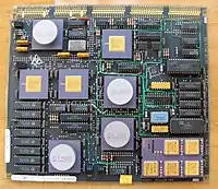 The CPU used 145 MCAs. These are large scale integration devices fabricated by Motorola in their 3 μm MOSAIC bipolar process. They are packaged in 68-pin leadless chip carriers or pin grid arrays and are mounted onto the printed circuit board in sockets or soldered in place. An additional 1,100 small scale integration (SSI) and medium scale integration (MSI) ECL logic devices are used. These ICs are spread out over 17 modules plugged into a backplane.