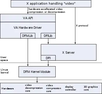The current interface is window system independent, so that it can potentially be used with graphics sub-systems other than the DRI (Direct Rendering Infrastructure) in X Window System, such as direct with framebuffer, and it can work with third-party DRM (Direct Rendering Manager) libraries. In a nutshell, it is a scheme to pass various types of data buffers from the application to the GPU for decoding or encoding a compressed bit-stream.