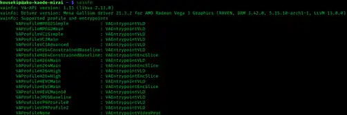 An example of vainfo output, showing supported video codecs for VA-API acceleration