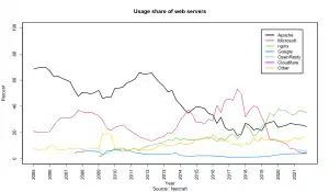 Apache resulted in the most used web server from mid-1996 to the end of 2015 when, after a few years of decline, it was surpassed initially by IIS and then by Nginx. Afterward IIS dropped to much lower percentages of usage than Apache (see also market share).