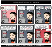 The creative freedom webcomics provide allows artists to work in nontraditional styles. Clip art or photo comics (also known as fumetti) are two types of webcomics that do not use traditional artwork. A Softer World, for example, is made by overlaying photographs with strips of typewriter-style text.[6] As in the constrained comics tradition, a few webcomics, such as Dinosaur Comics by Ryan North, are created with most strips having art copied exactly from one (or a handful of) template comics and only the text changing.[7] Pixel art, such as that created by Richard Stevens of Diesel Sweeties, is similar to that of sprite comics but instead uses low-resolution images created by the artist themself.[8] However, it is also common for some artists to use traditional styles, similar to those typically published in newspapers or comic books.