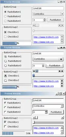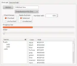 A graphical widget (also graphical control element or control) in a graphical user interface is an element of interaction, such as a button or a scroll bar. Controls are software components that a computer user interacts with through direct manipulation to read or edit information about an application. User interface libraries such as Windows Presentation Foundation, Qt, GTK, and Cocoa, contain a collection of controls and the logic to render these.[1]