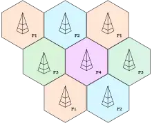 Example of frequency reuse factor or pattern, for four frequencies (F1-F4)