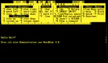 WordStar 3.0, the first version for MS-DOS, appeared in April 1982.[9][10] The DOS version was very similar to the original, and although the IBM PC had arrow keys and separate function keys, the traditional "WordStar diamond" and other Ctrl-key functions were retained,[5] leading to rapid adoption by former CP/M users. WordStar's ability to use a "non-document" mode to create text files without formatting made it popular among programmers for writing code.[11] Like the CP/M versions, the DOS WordStar was not explicitly designed for IBM PCs, but rather for any x86 machine (as there were a number of non-IBM-compatible PCs that used 8086 or 80186 CPUs). As such, it used only DOS's API calls and avoided any BIOS usage or direct hardware access. This carried with it an unfortunate performance penalty as everything had to be "double" processed (meaning that the DOS API functions would handle screen or keyboard I/O first and then pass them to the BIOS).