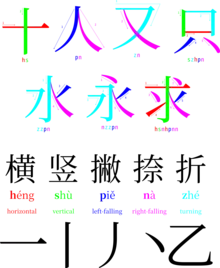 Each of the five keys from 1 to 5 are assigned a certain type of stroke (resembling the Eight Principles of Yong; these five are sometimes called 橫竖撇捺折[lower-alpha 1] (héng-shù-piē-nà-zhé) with each character of this phrase being a one-syllable description of the respective five strokes:[lower-alpha 2]