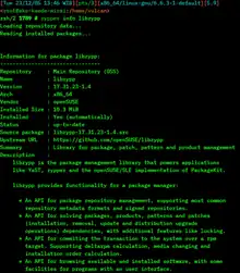 ZYpp (or libzypp; "Zen / YaST Packages Patches Patterns Products"[6]) is a package manager engine that powers Linux applications like YaST, Zypper and the implementation of PackageKit for openSUSE and SUSE Linux Enterprise.[7] Unlike some more basic package managers, it provides a satisfiability solver to compute package dependencies.[8] It is a free and open-source software project sponsored by SUSE and licensed under the terms of the GNU General Public License v2 or later. ZYpp is implemented mostly in the programming language C++.