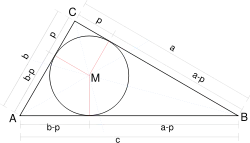 The hyperbolic plane is hyperbolic: in fact the incircle of a geodesic triangle is the circle of largest diameter contained in the triangle and every geodesic triangle lies in the interior of an ideal triangle, all of which are isometric with incircles of diameter 2 log 3.[6] Note that in this case the Gromov product also has a simple interpretation in terms of the incircle of a geodesic triangle. In fact the quantity (A,B)C is just the hyperbolic distance p from C to either of the points of contact of the incircle with the adjacent sides: for from the diagram c = (a – p) + (b – p), so that p = (a + b – c)/2 = (A,B)C.[7]
