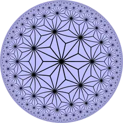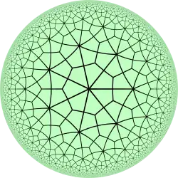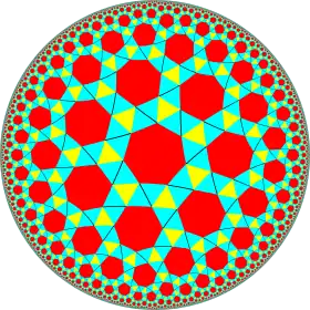 To construct the triangle group, start with a hyperbolic triangle with angles π/2, π/3, and π/7. This triangle, the smallest hyperbolic Schwarz triangle, tiles the plane by reflections in its sides. Consider then the group generated by reflections in the sides of the triangle, which (since the triangle tiles) is a non-Euclidean crystallographic group (a discrete subgroup of hyperbolic isometries) with this triangle for fundamental domain; the associated tiling is the order-3 bisected heptagonal tiling. The (2,3,7) triangle group is defined as the index 2 subgroups consisting of the orientation-preserving isometries, which is a Fuchsian group (orientation-preserving NEC group).