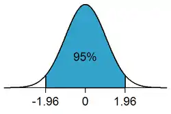 In probability and statistics, the 97.5th percentile point of the standard normal distribution is a number commonly used for statistical calculations. The approximate value of this number is 1.96, meaning that 95% of the area under a normal curve lies within approximately 1.96 standard deviations of the mean. Because of the central limit theorem, this number is used in the construction of approximate 95% confidence intervals. Its ubiquity is due to the arbitrary but common convention of using confidence intervals with 95% probability in science and frequentist statistics, though other probabilities (90%, 99%, etc.) are sometimes used.[1][2][3][4] This convention seems particularly common in medical statistics,[5][6][7] but is also common in other areas of application, such as earth sciences,[8] social sciences and business research.[9]