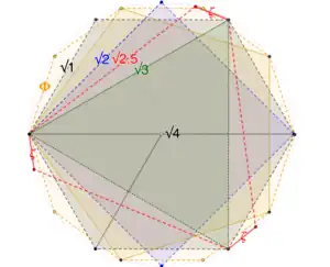 Since the 120-cell has a circumference of 30 edges, it has 15 distinct chord lengths, ranging from its edge length to its diameter.[lower-alpha 36] Every regular convex 4-polytope is inscribed in the 120-cell, and the 15 chords enumerated in the rows of the following table are all the distinct chords that make up the regular 4-polytopes and their great circle polygons.[lower-alpha 39]