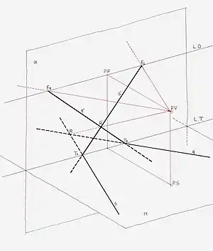 Graphical projection methods rely on the duality between lines and points, whereby two straight lines determine a point while two points determine a straight line. The orthogonal projection of the eye point onto the picture plane is called the principal vanishing point (P.P. in the scheme on the right, from the Italian term punto principale, coined during the renaissance).[7]