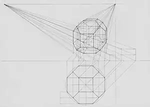 The principal vanishing point is the vanishing point of all horizontal lines perpendicular to the picture plane. The vanishing points of all horizontal lines lie on the horizon line. If, as is often the case, the picture plane is vertical, all vertical lines are drawn vertically, and have no finite vanishing point on the picture plane. Various graphical methods can be easily envisaged for projecting geometrical scenes. For example, lines traced from the eye point at 45° to the picture plane intersect the latter along a circle whose radius is the distance of the eye point from the plane, thus tracing that circle aids the construction of all the vanishing points of 45° lines; in particular, the intersection of that circle with the horizon line consists of two distance points. They are useful for drawing chessboard floors which, in turn, serve for locating the base of objects on the scene. In the perspective of a geometric solid on the right, after choosing the principal vanishing point —which determines the horizon line— the 45° vanishing point on the left side of the drawing completes the characterization of the (equally distant) point of view. Two lines are drawn from the orthogonal projection of each vertex, one at 45° and one at 90° to the picture plane. After intersecting the ground line, those lines go toward the distance point (for 45°) or the principal point (for 90°). Their new intersection locates the projection of the map. Natural heights are measured above the ground line and then projected in the same way until they meet the vertical from the map.