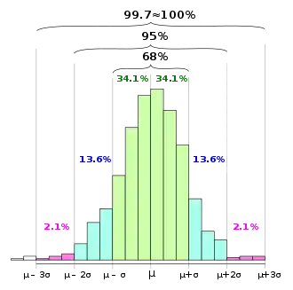 For an approximately normal data set, the values within one standard deviation of the mean account for about 68% of the set; while within two standard deviations account for about 95%; and within three standard deviations account for about 99.7%. Shown percentages are rounded theoretical probabilities intended only to approximate the empirical data derived from a normal population.