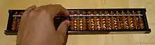 An abacus (pl.: abaci or abacuses), also called a counting frame, is a hand-operated calculating tool which was used from ancient times in the ancient Near East, Europe, China, and Russia, until the adoption of the Arabic numeral system.[1] An abacus consists of a two-dimensional array of slidable beads (or similar objects). In their earliest designs, the beads could be loose on a flat surface or sliding in grooves. Later the beads were made to slide on rods and built into a frame, allowing faster manipulation.