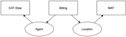 Graph 1 details some explicit relationships between the objects of the diagram. For example, the arrow between the agent and CAT:Elsie depicts an example of an is-a relationship, as does the arrow between the location and the MAT. The arrows between the gerund/present participle SITTING and the nouns agent and location express the diagram's basic relationship; "agent is SITTING on location"; Elsie is an instance of CAT.[12]
