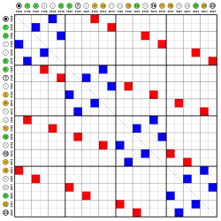 Because each entry in the adjacency matrix requires only one bit, it can be represented in a very compact way, occupying only |V |2 / 8 bytes to represent a directed graph, or (by using a packed triangular format and only storing the lower triangular part of the matrix) approximately |V |2 / 16 bytes to represent an undirected graph. Although slightly more succinct representations are possible, this method gets close to the information-theoretic lower bound for the minimum number of bits needed to represent all n-vertex graphs.[13] For storing graphs in text files, fewer bits per byte can be used to ensure that all bytes are text characters, for instance by using a Base64 representation.[14] Besides avoiding wasted space, this compactness encourages locality of reference. However, for a large sparse graph, adjacency lists require less storage space, because they do not waste any space representing edges that are not present.[12][15]