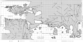 Gianluca Gorni's reconstruction of the section of al-Khwārizmī's world map concerning the Indian Ocean. The majority of the placenames used by al-Khwārizmī match those of Ptolemy, Martellus and Behaim. The general shape of the coastline is the same between Taprobane and Cattigara. The Dragon's Tail, or the eastern opening of the Indian Ocean, which does not exist in Ptolemy's description, is traced in very little detail on al-Khwārizmī's map, although is clear and precise on the Martellus map and on the later Behaim version.
