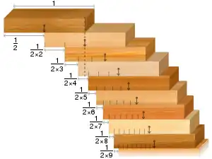 In the block-stacking problem, one must place a pile of identical rectangular blocks, one per layer, so that they hang as far as possible over the edge of a table without falling. The top block can be placed with of its length extending beyond the next lower block. If it is placed in this way, the next block down needs to be placed with at most of its length extending beyond the next lower block, so that the center of mass of the top two block is supported and they do not topple. The third block needs to be placed with at most of its length extending beyond the next lower block, and so on. In this way, it is possible to place the blocks in such a way that they extend lengths beyond the table, where is the th harmonic number.[24][25] The divergence of the harmonic series implies that there is no limit on how far beyond the table the block stack can extend.[25] For stacks with one block per layer, no better solution is possible, but significantly more overhang can be achieved using stacks with more than one block per layer.[26]