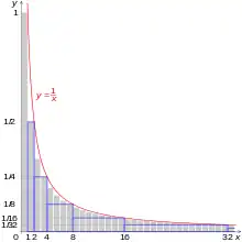 In the figure to the right, shifting each rectangle to the left by 1 unit, would produce a sequence of rectangles whose boundary lies below the curve rather than above it. This shows that the partial sums of the harmonic series differ from the integral by an amount that is bounded above and below by the unit area of the first rectangle:
