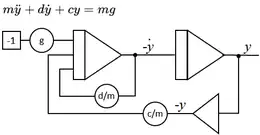 Electronic analog computers are especially well-suited to representing situations described by differential equations. Historically, they were often used when a system of differential equations proved very difficult to solve by traditional means. As a simple example, the dynamics of a spring-mass system can be described by the equation , with as the vertical position of a mass , the damping coefficient, the spring constant and the gravity of Earth. For analog computing, the equation is programmed as . The equivalent analog circuit consists of two integrators for the state variables (speed) and (position), one inverter, and three potentiometers.