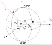 To derive the equation that describes the angular separation of two points located on the surface of a sphere as seen from the center of the sphere, we use the example of two astronomical objects and observed from the Earth. The objects and are defined by their celestial coordinates, namely their right ascensions (RA), ; and declinations (dec), . Let indicate the observer on Earth, assumed to be located at the center of the celestial sphere. The dot product of the vectors and is equal to: