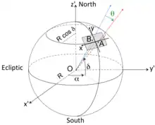 Note that the -axis is equal to the declination, whereas the -axis is the right ascension modulated by because the section of a sphere of radius at declination (latitude) is (see Figure).