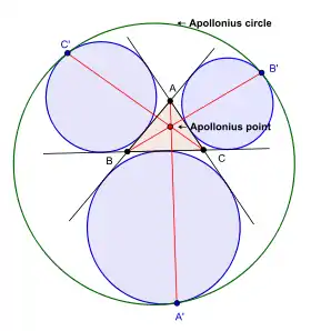 - Let △ABC be any given triangle. Let the excircles of △ABC opposite to the vertices A, B, C be EA, EB, EC respectively. Let E be the circle which touches the three excircles EA, EB, EC such that the three excircles are within E. Let A', B', C' be the points of contact of the circle E with the three excircles. The lines AA', BB', CC' are concurrent. The point of concurrence is the Apollonius point of △ABC.