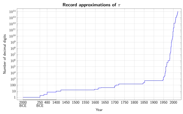 The record of manual approximation of π is held by William Shanks, who calculated 527 decimals correctly in 1853.[1] Since the middle of the 20th century, the approximation of π has been the task of electronic digital computers (for a comprehensive account, see Chronology of computation of π). On 14 March, 2024 the current record was established by Jordan Ranous, Kevin O’Brien, and Brian Beeler with Alexander Yee's y-cruncher with 105 trillion (1.05×1014) digits.[2]